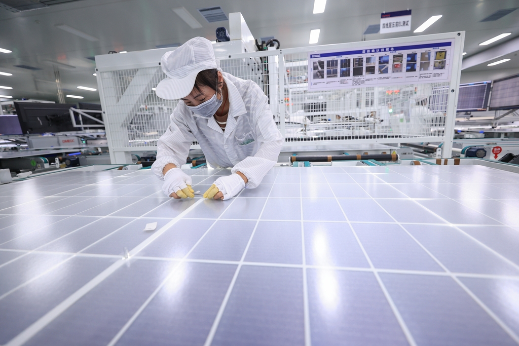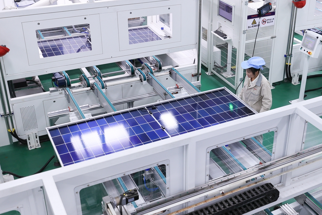 配文:10月15日,,江苏省连云港市赣榆经济开发区一家新能源企业,,工人正在加紧生产一批出口外洋的太阳能光伏电池组件。。
