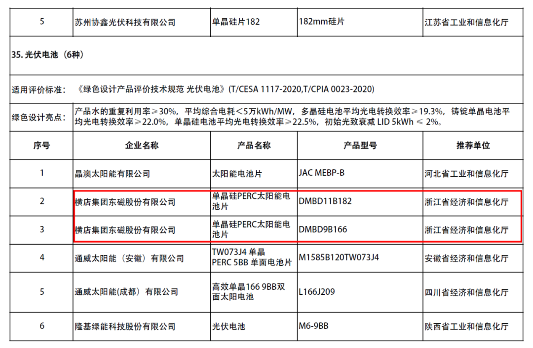 继2020年入选天下第五批绿色工厂名单之后,,,横店8868体育官方版最新版再次获得国家级绿色方面的认可——克日,,,国家工信部宣布2021年度绿色制造名单,,,公司六个型号的单晶硅PERC太阳能电池片、高效单晶硅组件产品成为“绿色设计产品”。。。。。